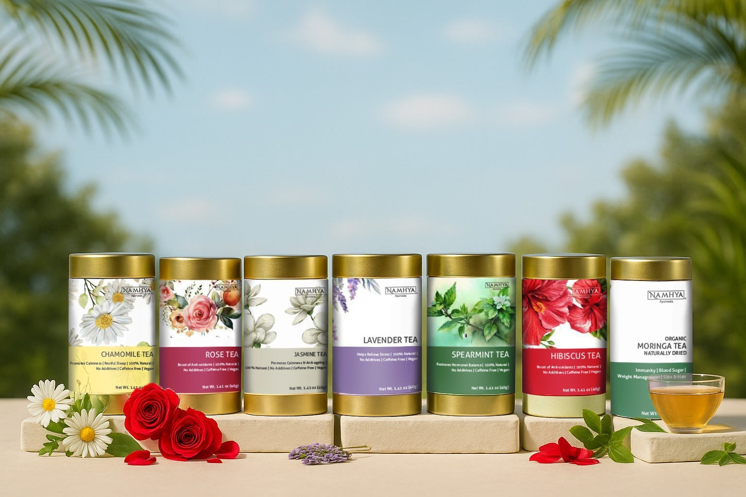 Includes: Lavender, Chamomile, Hibiscus, Rose, Moringa, Spearmint & Jasmine teas.